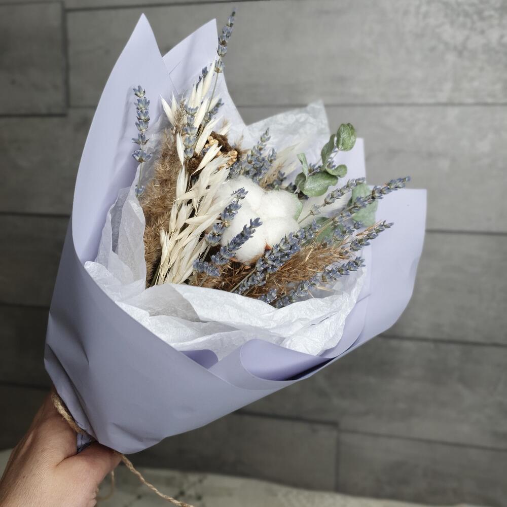 Танацетум – 1 шт.Упаковка дизайнерская – 1 шт.Хлопок натуральный – 1 шт.Лагурус (сухоцвет) – 3 шт.Эвкалипт сухоцвет – 1 шт.овес сухоцвет – 2 шт.сорго – 1 шт.лавандин пучок – 1 шт.камыш декоративный пучок – 1 шт.
