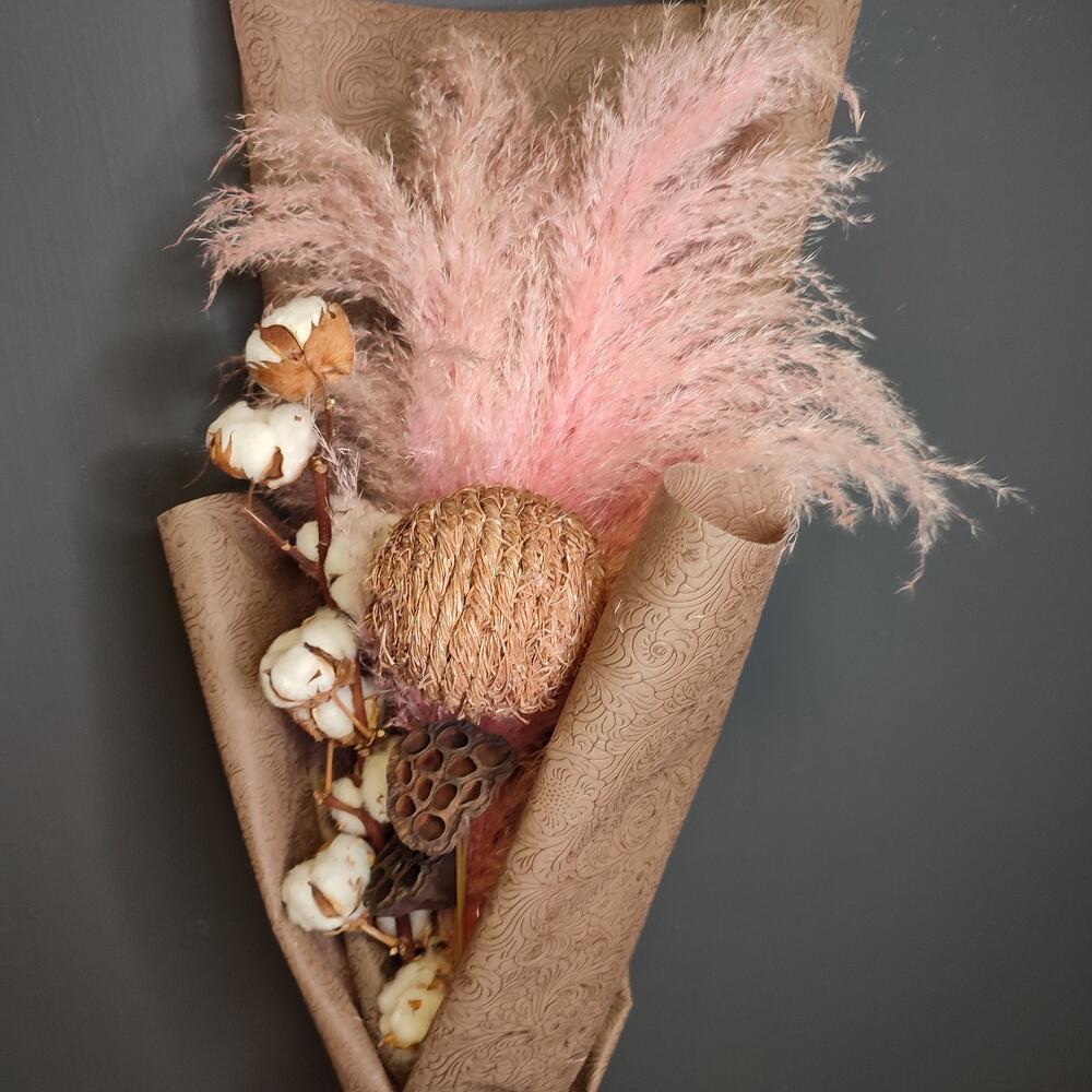 пампасная трава – 2 шт.Хлопок натуральный – 11 шт.Лотос сухой – 2 шт.Шар декоративный – 1 шт.Упаковка дизайнерская – 2 шт.