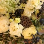 Ранункулюс – 3 шт.Лизиантус – 3 шт.Эрингиум – 2 шт.Лотос (коробочка) – 2 шт.Вибурнум ягодный – 4 шт.Амми – 2 шт.Лаванда – 15 шт.Питтоспорум – 3 шт.Лента – 1 шт.