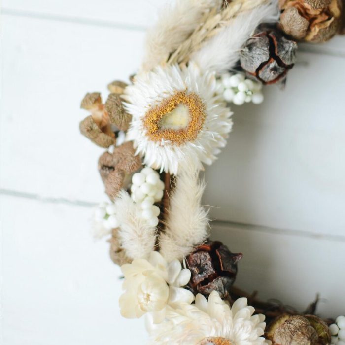 Основа для венка – 1 шт.Хлопок – 1 шт.сухоцветы микс – 1 шт.ветка искусственная белая – 1 шт.Тишью – 1 шт.Коробка – 1 шт.