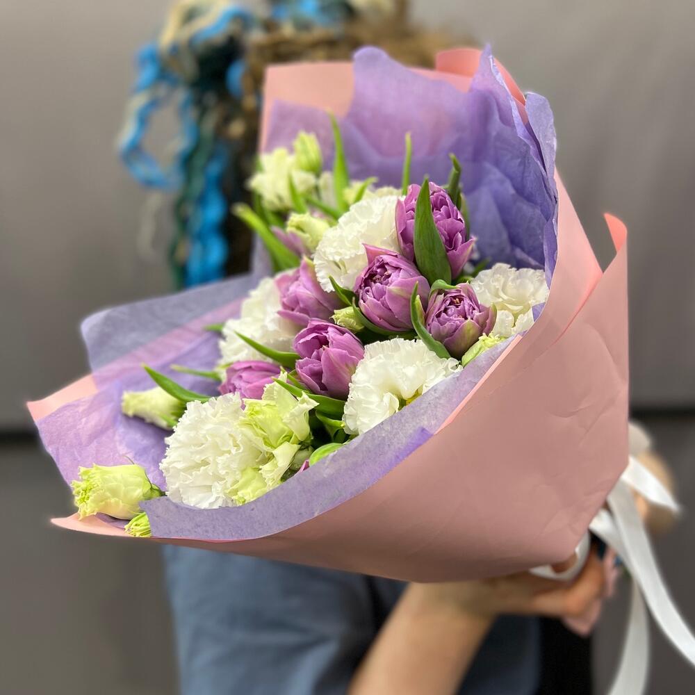 Тюльпан пионовидный – 9 шт.эустома махровая – 2 шт.Тишью – 2 шт.Пленка матовая – 2 шт.Лента атласная – 2 шт.