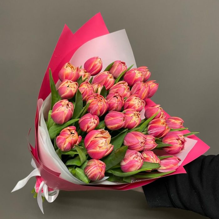 Яркий, большой, объемный букет из 31 пионовидного тюльпана. Эффектный подарок!