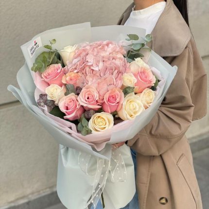 Евро-Букет из Гортензии ,Розовых Роз,Лизиантусов и Эвкалипта + открытка ручной работы в подарок