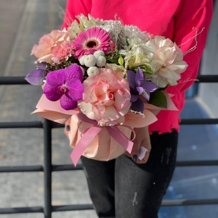 Хризантемы и Пионовидные кустовые розы в коробке + открытка ручной работы в подарок
